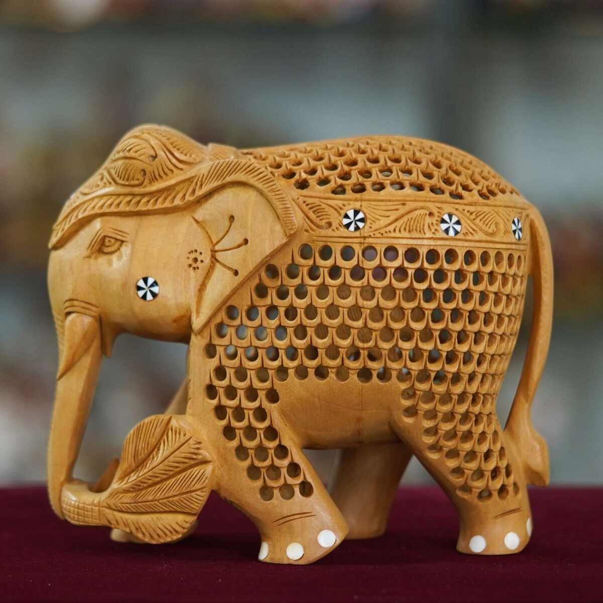 Wood Carving Undercut Jali Work Elephant Statue Beautiful Decorative Showpiece Figurine for Home Decor & Gift Purpose