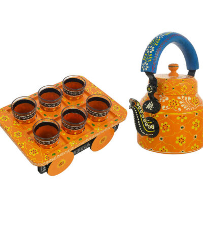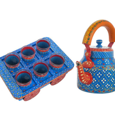 HandPainted Alluminium Tea Kettle with 6 Glasses and Wooden Tray For Home D?cor , Tea Party , Serving