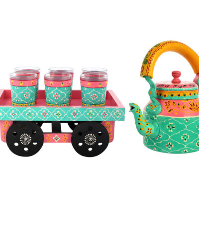 HandPainted Alluminium Tea Kettle with Four Glasses and Wooden Tray For Home D?cor , Tea Party , Serving